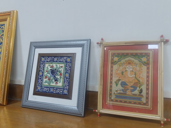 Diese Geschenke werden stolz in unserem Büro ausgestellt und bilden eine lebendige Kulturgalerie. Darunter befinden sich wunderschön gearbeitete dekorative Teller und Kunstwerke, die starke Einflüsse islamischer Kunsttraditionen widerspiegeln. Die komplizierten geometrischen Muster, Blumenmotive und kalligraphischen Elemente lassen auf einen Ursprung in Regionen wie Zentralasien und dem Nahen Osten schließen. Eine markante Platte weist detaillierte Ornamentmuster auf, die üblicherweise mit Usbekistan in Verbindung gebracht werden, das für seine reiche Geschichte entlang der Seidenstraße bekannt ist. Ein weiteres gerahmtes Kunstwerk scheint die traditionelle islamische Designsprache zu verkörpern – Symmetrie, Präzision und ein tiefes Gefühl für Harmonie.